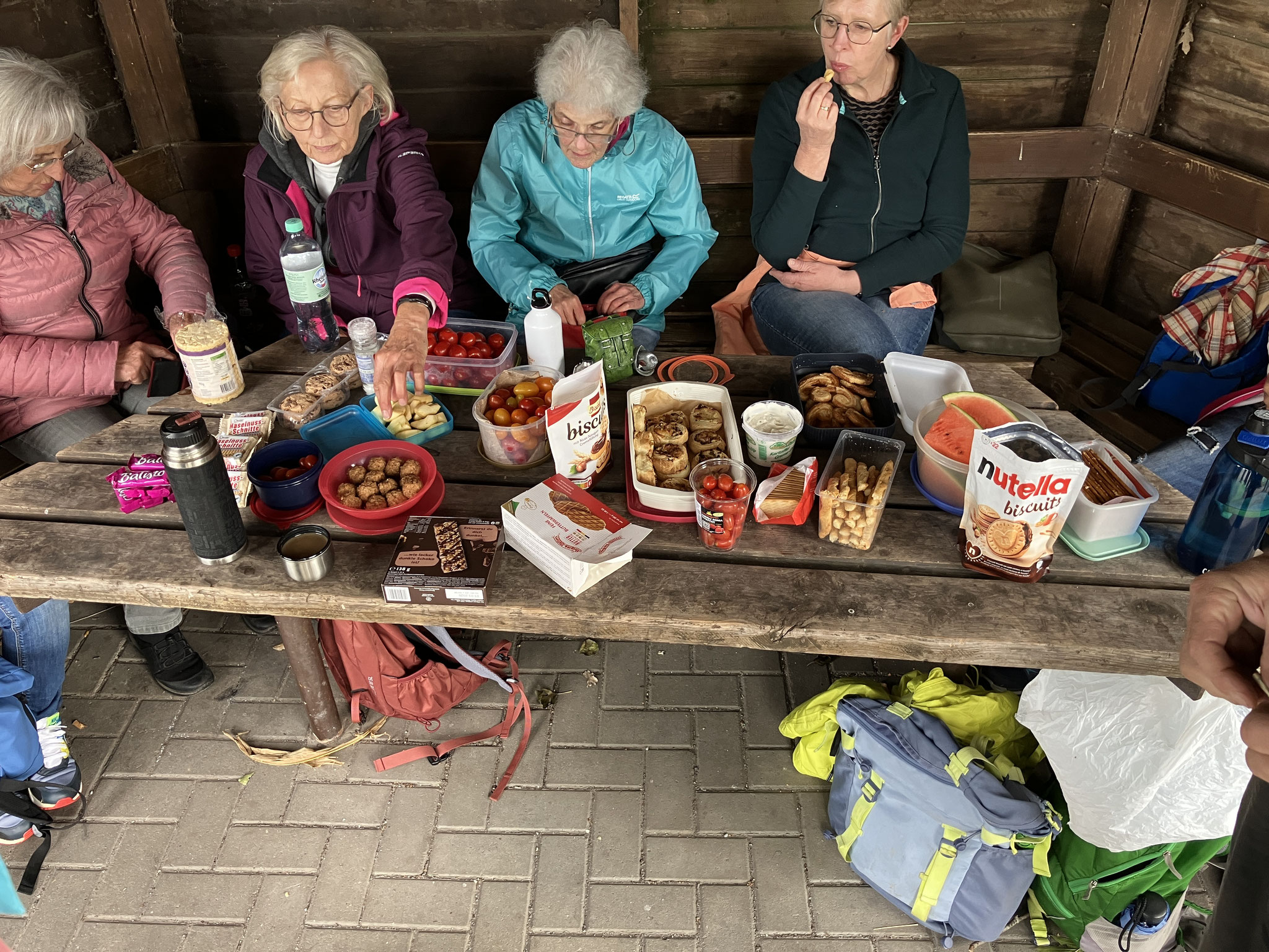In einer der Wanderpavillons am Weg wurde dann regelrecht geschlemmt. Jeder Teilnehmer zog seine mitgebrachten kleinen Häppchen aus dem Rucksack und zack - fertig war ein wunderbares Wander Tappas Menü. Eine perfekte Outdoor Einkehr in geselliger Runde und dazu spendierte uns die Sonne noch ihre wärmenden Strahlen.